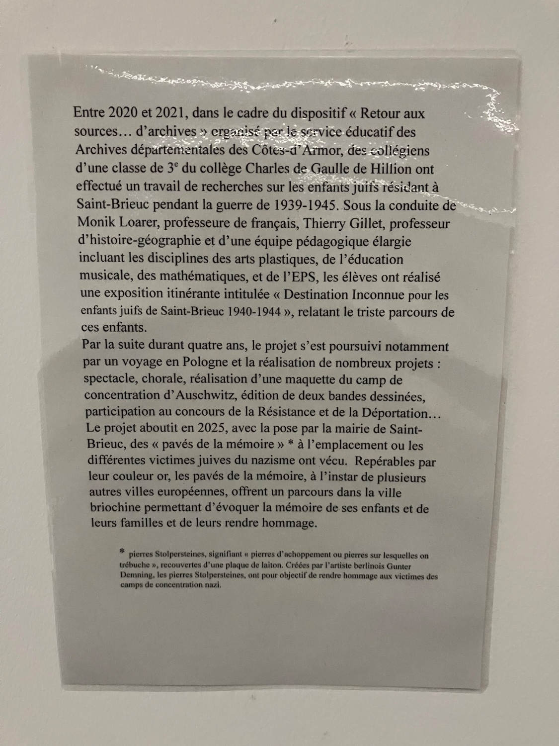 Commencé en 2020 dans le cadre du dispositif « Retour aux sources…d’archives » des Archives départementales, il s’est achevé par une exposition le 30 mai 2024, 80 ans après la déportation d’Alain Fékété (le dernier enfant juif de Saint-Brieuc) de Drancy… vers une destination inconnue (terme utilisé par les Juifs et l’administration française pour désigner un lieu de déportation vers l’Est).